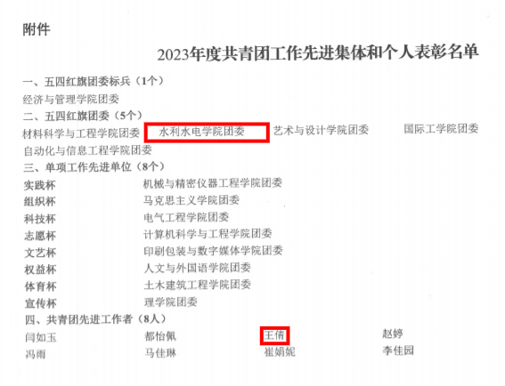 近日,共青团西安理工大学委员会印发《关于表彰2023年度先进集体和个人的决定》,PA集团团委荣获“2023年西安理工大学五四红旗团委”称号,学院团委书记王倩获“2023年西安理工大学共青团先进工作者”称号,水工201等五个团支部荣获“五四红旗团支部”,叶旭获“优秀共青团员标兵”、刘悦等91人获“优秀共青团员”,顾晓蕾等71人获“优秀共青团干部”。