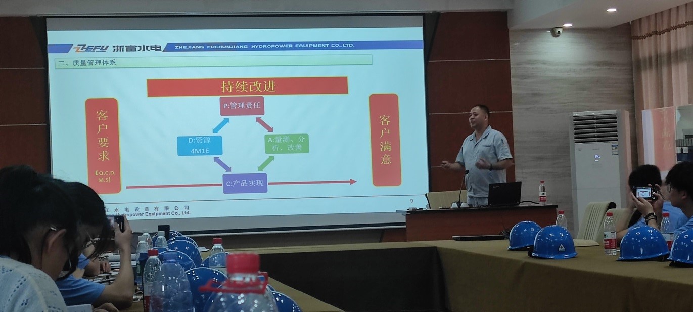 在浙富水电,首先由PA集团校友郑怀勇总经理、章焕能副总经理为实习学生分析了双碳背景下国际国内水电及新能源的发展机遇和挑战,讲述了浙富水电从一个很不起眼的配件厂成长为具有较强研发能力的、我国目前规模最大的民营水电机组专业制造商的发展历程,勉励同学们认真学习专业知识,为我国水电及新能源的发展贡献西理工力量。