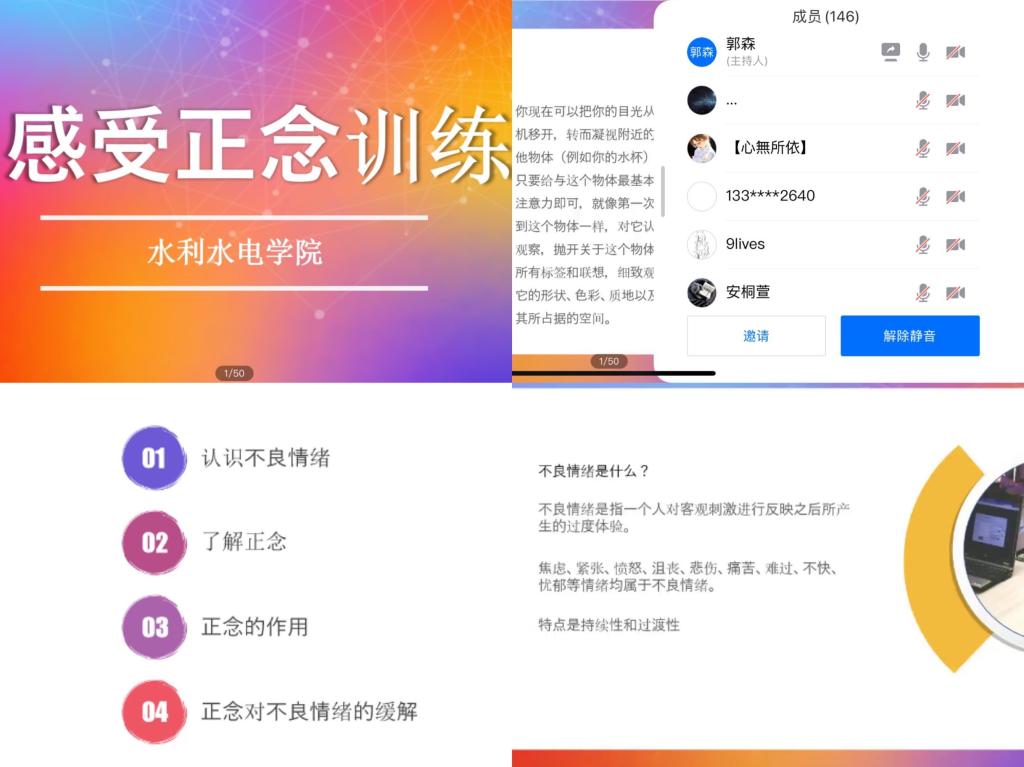 讲座中,郭森老师从专业的角度为大家阐明了“不良情绪、正念、冥想”等心理学概念,他结合当下疫情防控实际,用生动幽默的语言让学生感受和分析自我情绪,并学会用“正念”关注当下,而不做“好”与“坏”的评判。面对学生实际体验中的不良情绪,郭森给出几点建议:第一适当运动转移注意力,第二调节生物节律保障睡眠,第三直面情绪自我剖析。最后,在舒缓放松的音乐中,郭森带领全体同学初步感受正念训练,通过冥想的方式调节呼吸从而调整情绪和身体的状态,达到认清和接纳现实情况、缓解因环境而产生的焦虑和痛苦的目的。
