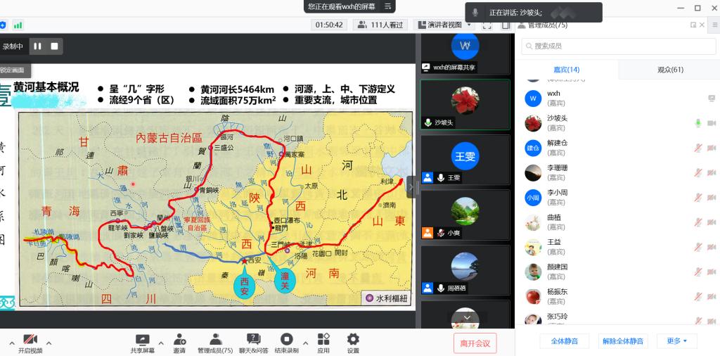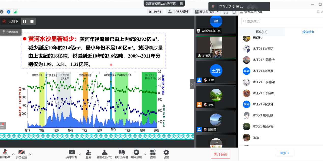 王新宏教授的报告,从黄河的基本情况,沿程水沙特性、黄河泥沙的来源,到黄河泥沙带来的防洪问题、下游河道变迁,梯级水库规划等内容,从三门峡水库历史回顾,黄河的历代治水过程,到未来黄河治理面临的新的挑战,做了系统、全面的讲座。一场报告,使得老师及学生们对过去几千年来黄河的治理历史有了较为全面的了解,并对黄河流域未来的生态治理满怀希冀。