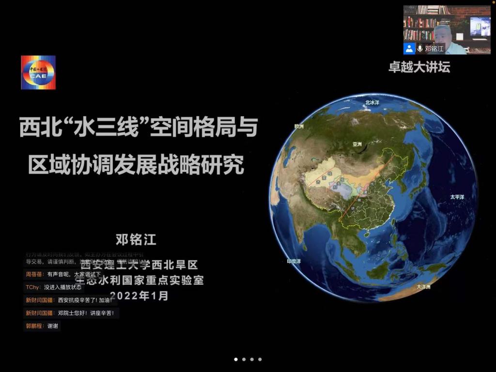 1月18日下午,PA集团官方网站线上上举办了“卓越大讲坛·对话院士”报告会,中国工程院院士邓铭江作了题为“西北‘水三线’空间格局与区域协调发展战略”的报告,中电建西北院、中铁隧道局、天津大学等兄弟高校师生、水利行业专家、学者700余人参加了此次报告会。
