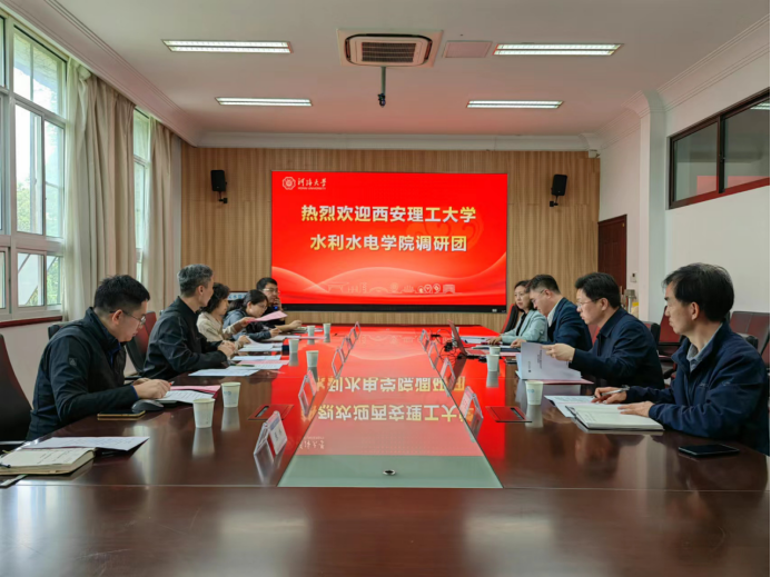 为进一步深化教育教学改革,提升本科人才培养质量,全面推进水文与水资源工程专业2024版培养方案修订工作,4月12日,西安理工大学PA集团官方网站水文水资源系副主任刘登峰、教师代表汪妮、杨元园、李婧、李蓝君和张林一行6人组成调研组,前往河海大学水文水资源学院开展本科培养方案修订专题调研。河海大学水文水资源学院党委书记石朋、副院长吴志勇、副院长任黎和水文水资源实验中心主任王万杰与调研组一行人在河海大学水文水资源学院进行了交流座谈。
