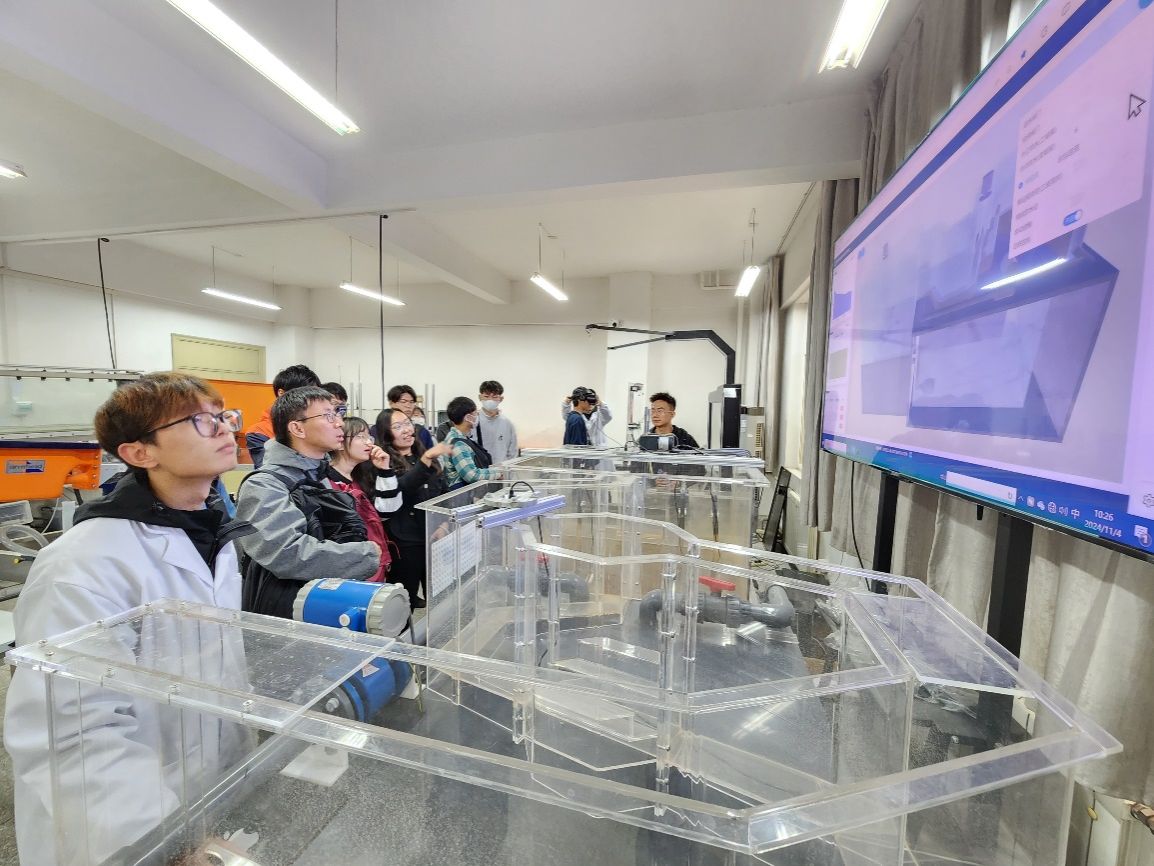 来访团详细了解了水电学院学科研究方向、科研成果以及实验室整体情况,参观了水工实验大厅、水力学实验大厅、微结构多功能检测实验室、流动可视化及多相流实验室、水文环境信息实验室、水质监测实验室和智慧水利三维实景实验室。Mostafa Rahimi Azghadi副教授一行对PA集团教学、科研自制实验仪器设备产生了浓厚的兴趣,与在场的师生进行了深入交流讨论。日本福井大学师生在参观期间积极提问,对VR设备展现出浓厚的兴趣,各位老师耐心地解答、主动示范。两校老师均表示希望今后能加强合作、开展更深层次的学术交流。