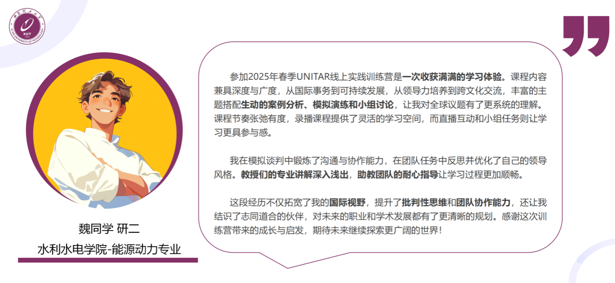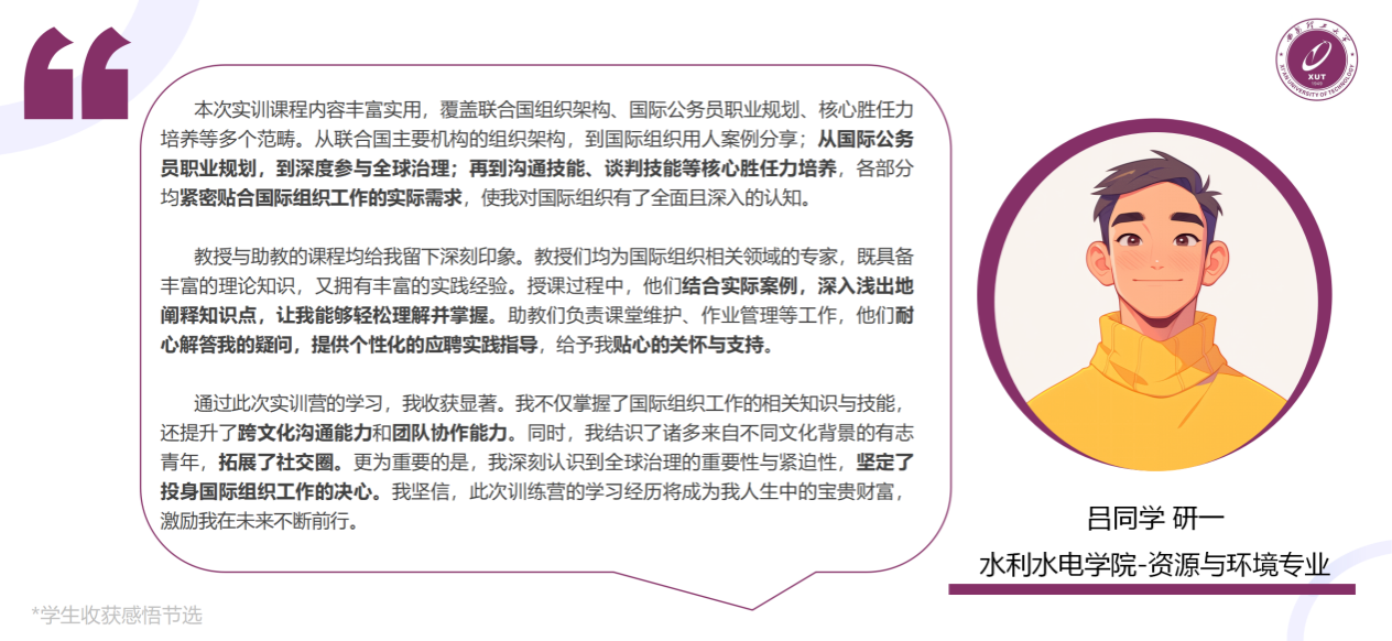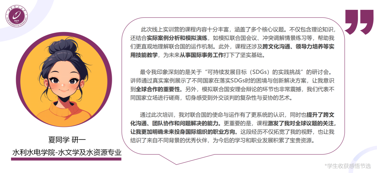 参与本次训练营的17名学子,在为期几周的紧张学习与实践中,表现出高度的积极性与良好的学习能力。他们不仅系统学习了联合国及相关国际组织的运作机制、核心职能与用人标准,更围绕全球热点议题展开深入研讨,拓宽了国际视野,获得了宝贵的专业指导与职业发展启示,并且都获得了由国际组织颁发的官方结业证书。参与本次训练营的学生均表示收获颇丰,有众多同学积极分享了自身的学习感悟,下面是部分同学的评价内容及作业展示。