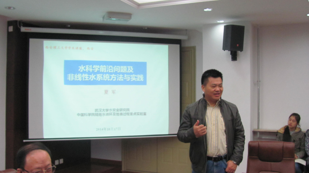 2014年10月17日上午10:00,武汉大学夏军教授在金花校区水电学院学科楼202会议室举办了“水科学前沿问题与非线性水系统方法与实践”的学术报告。PA集团官方网站院长李占斌、水文水资源学科带头人黄强教授、与沈冰、李怀恩、吴军虎、罗军刚、史文娟、黄玲梅、莫淑红等教师及各位教师指导的研究生约40人共同参加了报告会。
